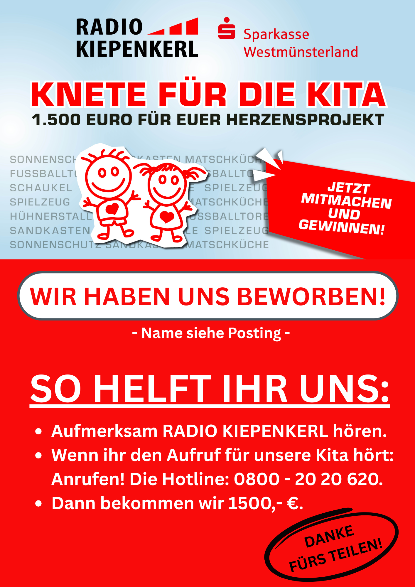 Hier für Social Media (Facebook, Insta oder WhatsApp Gruppe / Status) unser Flyer, damit ihr auf eure Bewerbung bei "Radio Kiepenkerl - KNETE FÜR DIE KITA" aufmerksam machen könnt. So steigert ihr eure Chancen, dass andere für euch "mithören" und ihr tatsächlich die 1500,- Euro bekommt. TIPP: Fleißig in der Kita, WhatsApp Gruppe und im Freundeskreis teilen.