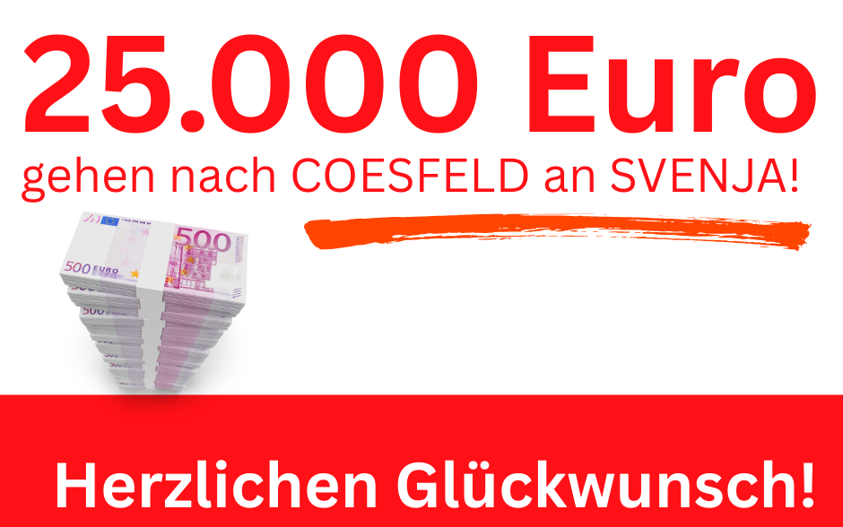 Habt ihr das Freitagmittag in unserem Programm gehört? Svenja aus Coesfeld hat 25.000 Euro im Geldregen gewonnen. Was für eine Hammer-Summe! Herzlichen Glückwunsch!