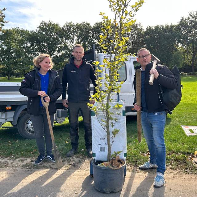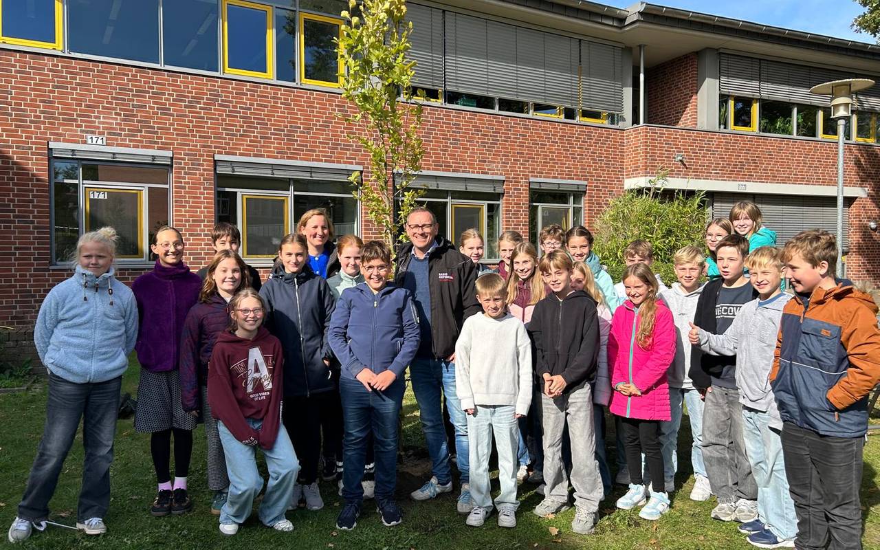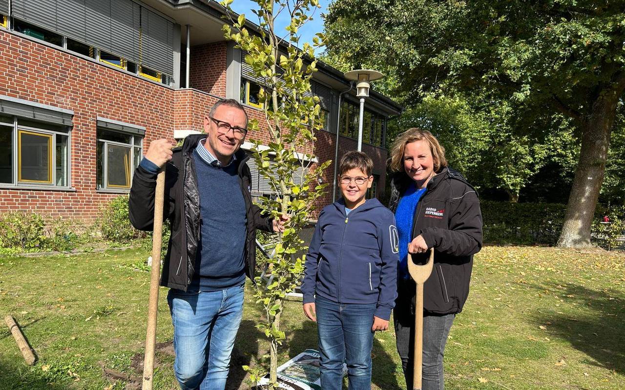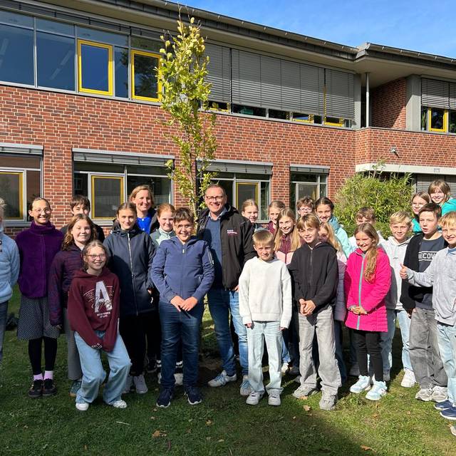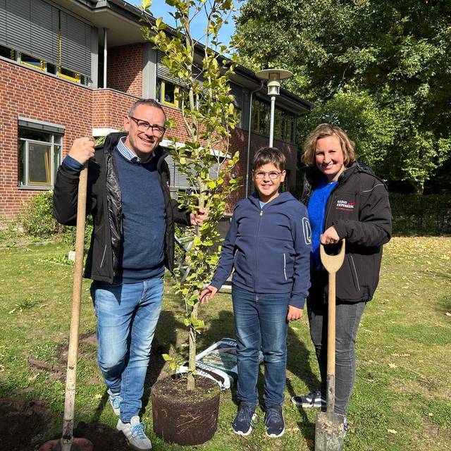 Hannah Stork und Andreas Kramer vom Morgenteam haben den Baum auf dem Schulgelände des Gymnasiums, mit tatkräftiger Unterstützung von Baumschulen Tüns aus Lüdinghausen, gepflanzt.