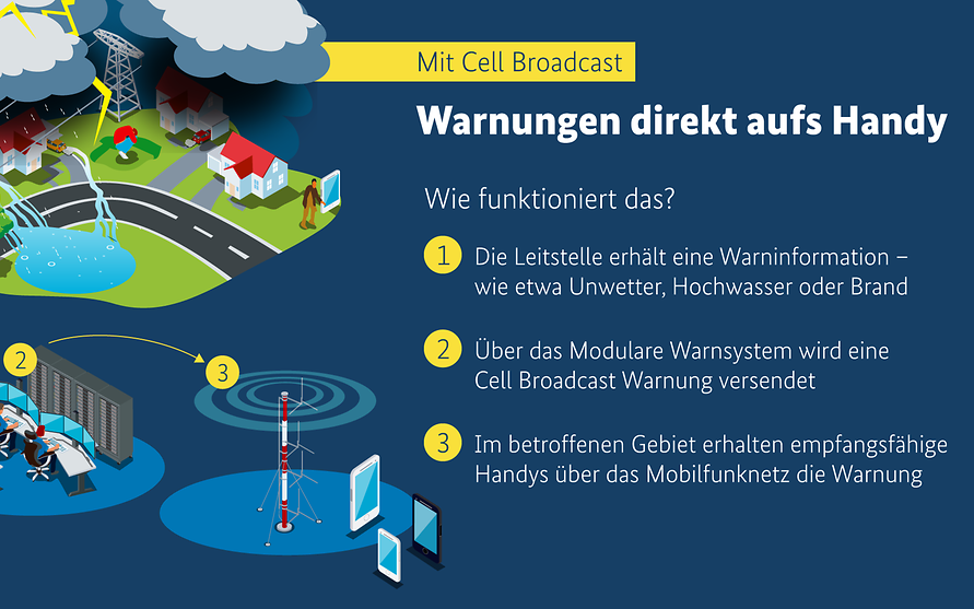 Nicht alle Handys können Cell Broadcast-Nachrichten empfangen. Ältere Geräte können dies oft nicht. Damit das eigene Handy Cell Broadcast-Nachrichten empfangen kann, benötigt es aktuelle Updates. Sonst funktioniert es nicht. Um die Nachricht zu empfangen, muss das Handy eingeschaltet und darf nicht im Flugmodus sein. In einigen älteren Geräten muss außerdem die Notfallbenachrichtigung aktiviert werden. Weitere Informationen der Mobilfunknetzbetreiber und Endgerätehersteller zu den Einstellungsmöglichkeiten sowie eine Liste mit empfangsfähigen Geräten finden Sie HIER!