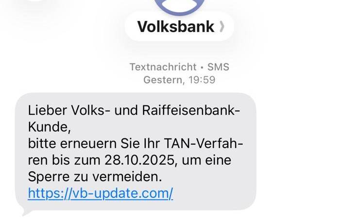 Betrüger versuchen immer wieder mit Maschen an Ihr Geld zu kommen. Jetzt warnen die Volksbank Westmünsterland im Kreis Coesfeld und Radio Kiepenkerl-Hörer Heino aus Coesfeld. Er hat aktuell angeblich eine SMS von der Volksbank bekommen. Um das TAN-Verfahren zu erneuern, sollte er auf einen Link klicken – und dann seine Bankdaten eintragen.