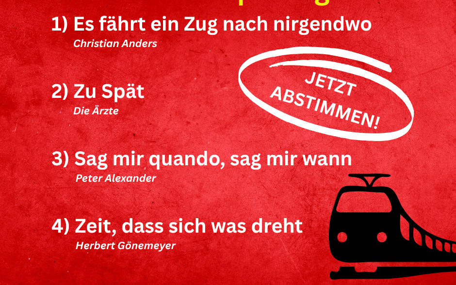 Es gibt immer wieder Ärger mit großen Verspätungen bei der Bahn. Wir suchen die besten "Bahn-Verspätungs-Hits". Vielen Dank für die vielen Vorschläge. Hier sind die Top 5. Welcher Song passt am besten zur Deutschen Bahn? Schick uns gerne eine WhatsApp (Sprach-)Nachricht: 01522 2156354.