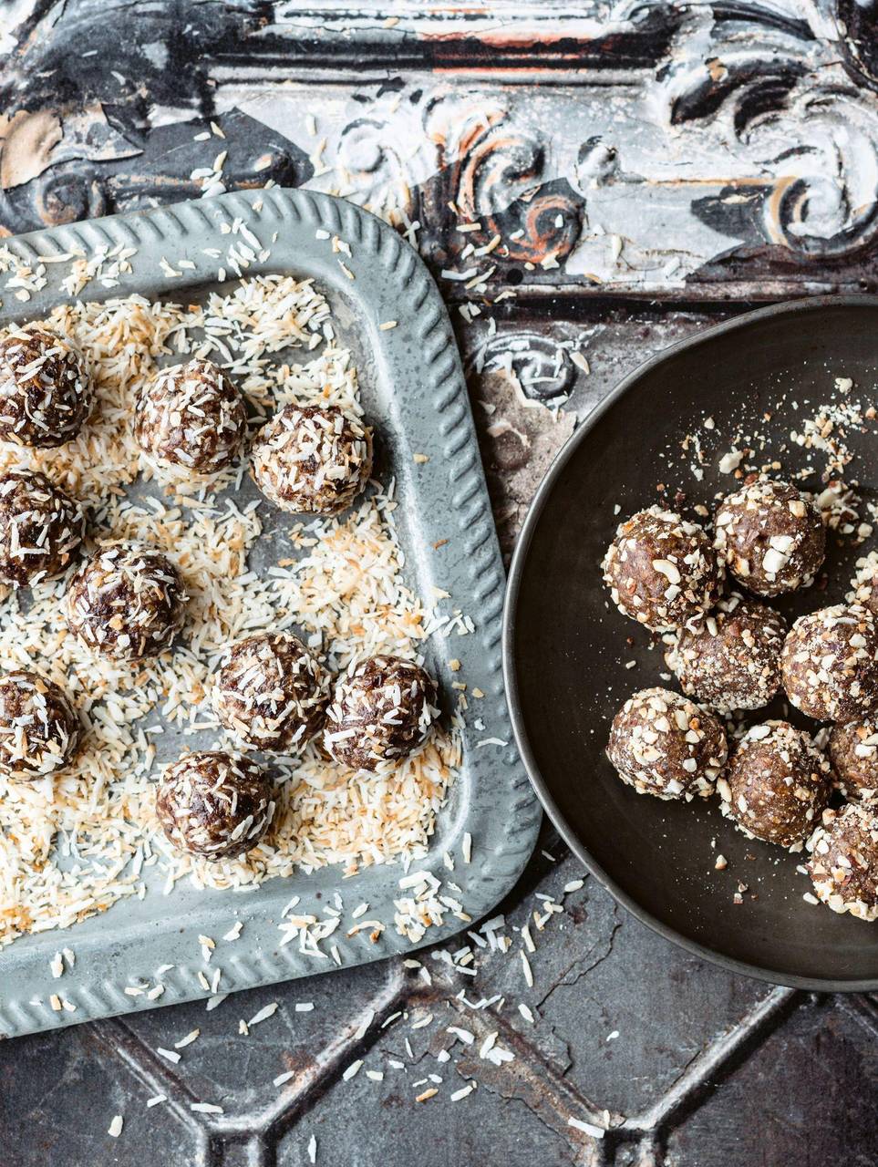 Dattel-Kokos-Bällchen (l) und Dattel-Nuss-Bällchen