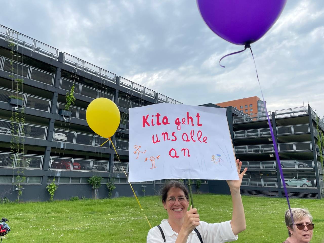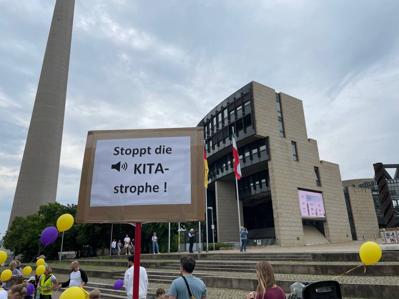 Kitaträger, Erzieherinnen und Erzieher, sowie viele Eltern treffen sich unter anderem in Düsseldorf vor dem Landtag. Sie wollen sich Gehör verschaffen.