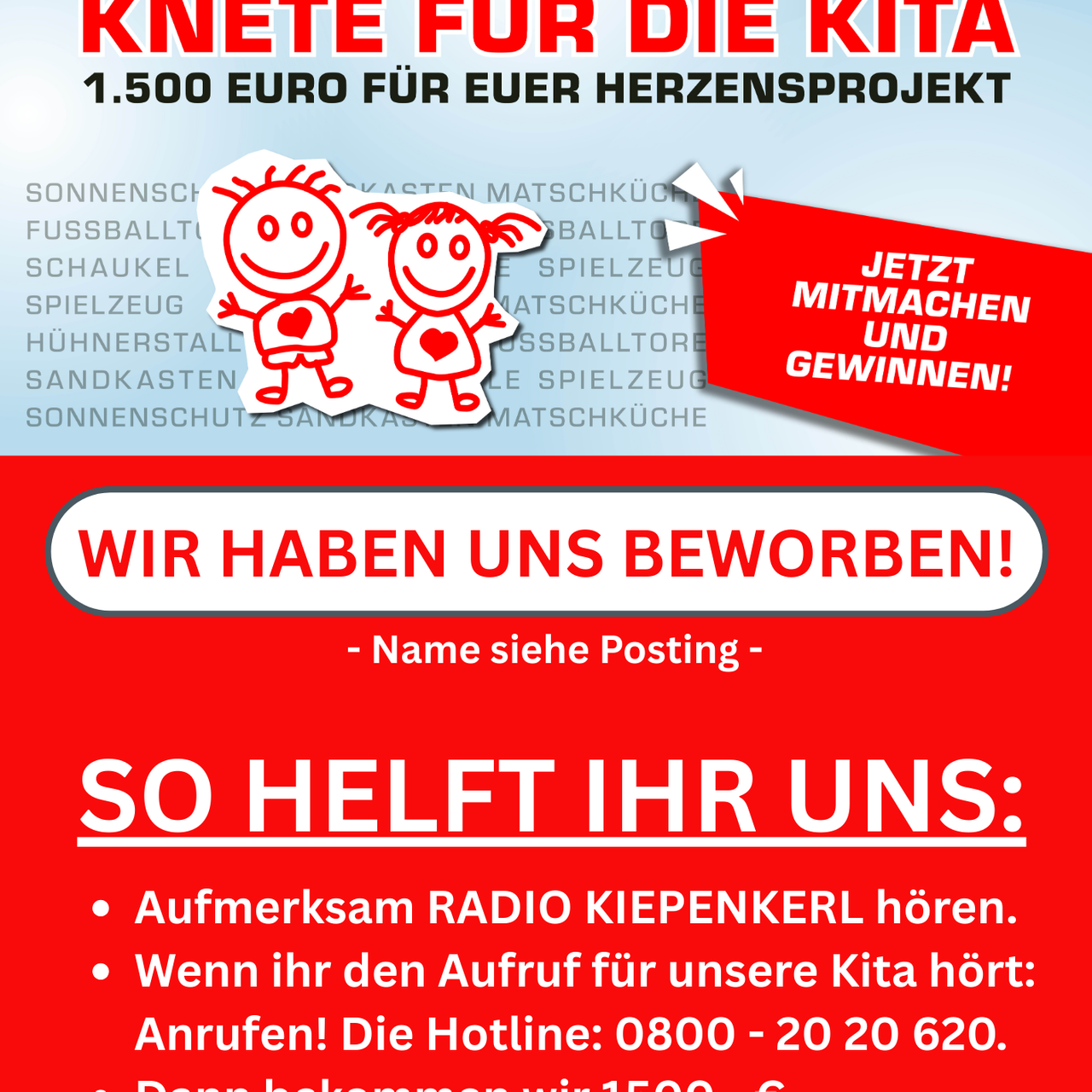 Hier für Social Media (Facebook, Insta oder WhatsApp Gruppe / Status) unser Flyer, damit ihr auf eure Bewerbung bei "Radio Kiepenkerl - KNETE FÜR DIE KITA" aufmerksam machen könnt. So steigert ihr eure Chancen, dass andere für euch "mithören" und ihr tatsächlich die 1500,- Euro bekommt. TIPP: Fleißig in der Kita, WhatsApp Gruppe und im Freundeskreis teilen.