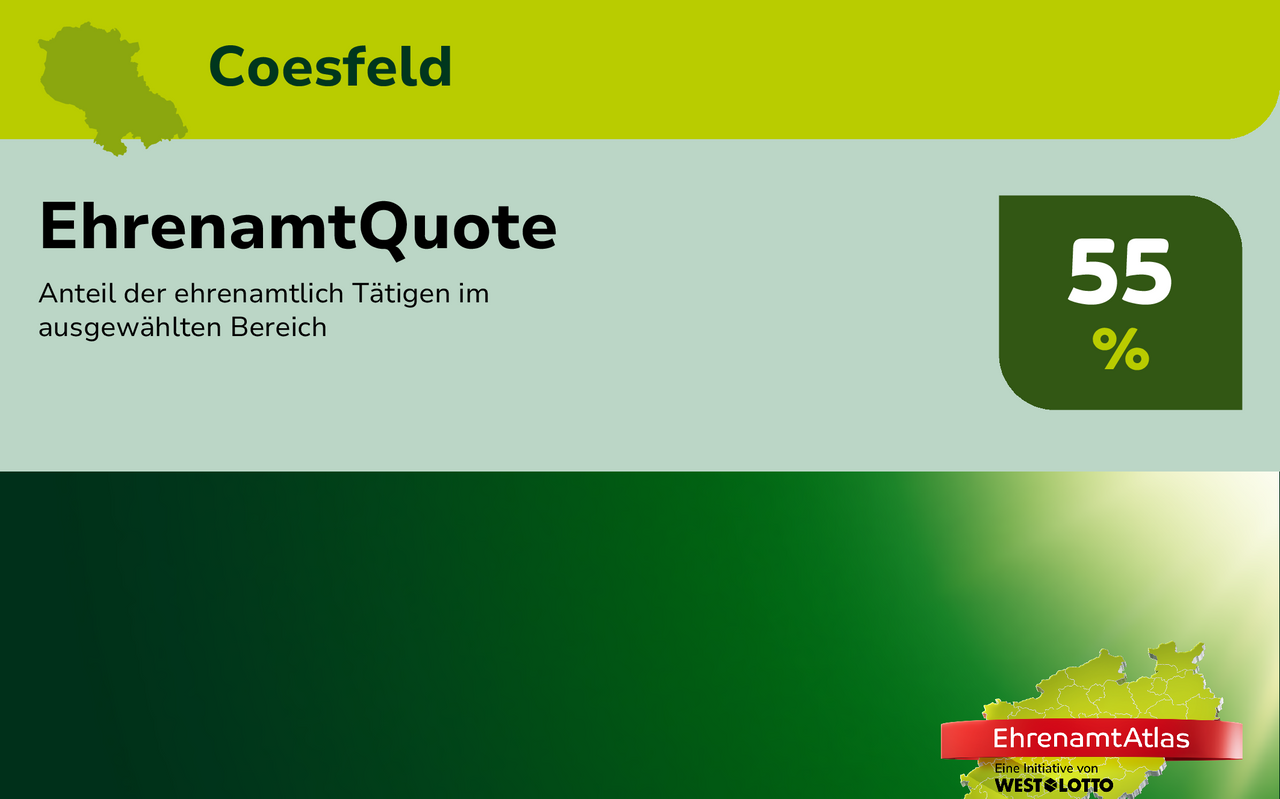 Menschen, die sich im Kreis Coesfeld ehrenamtlich engagieren, fühlen sich in ihrem Engagement im Landesvergleich besonders wertgeschätzt. Das zeigt der heute erschienene Ehrenamtsatlas. Denn der Kreis Coesfeld ragt beim Wertschätzungsindex in NRW im Landesvergleich heraus.