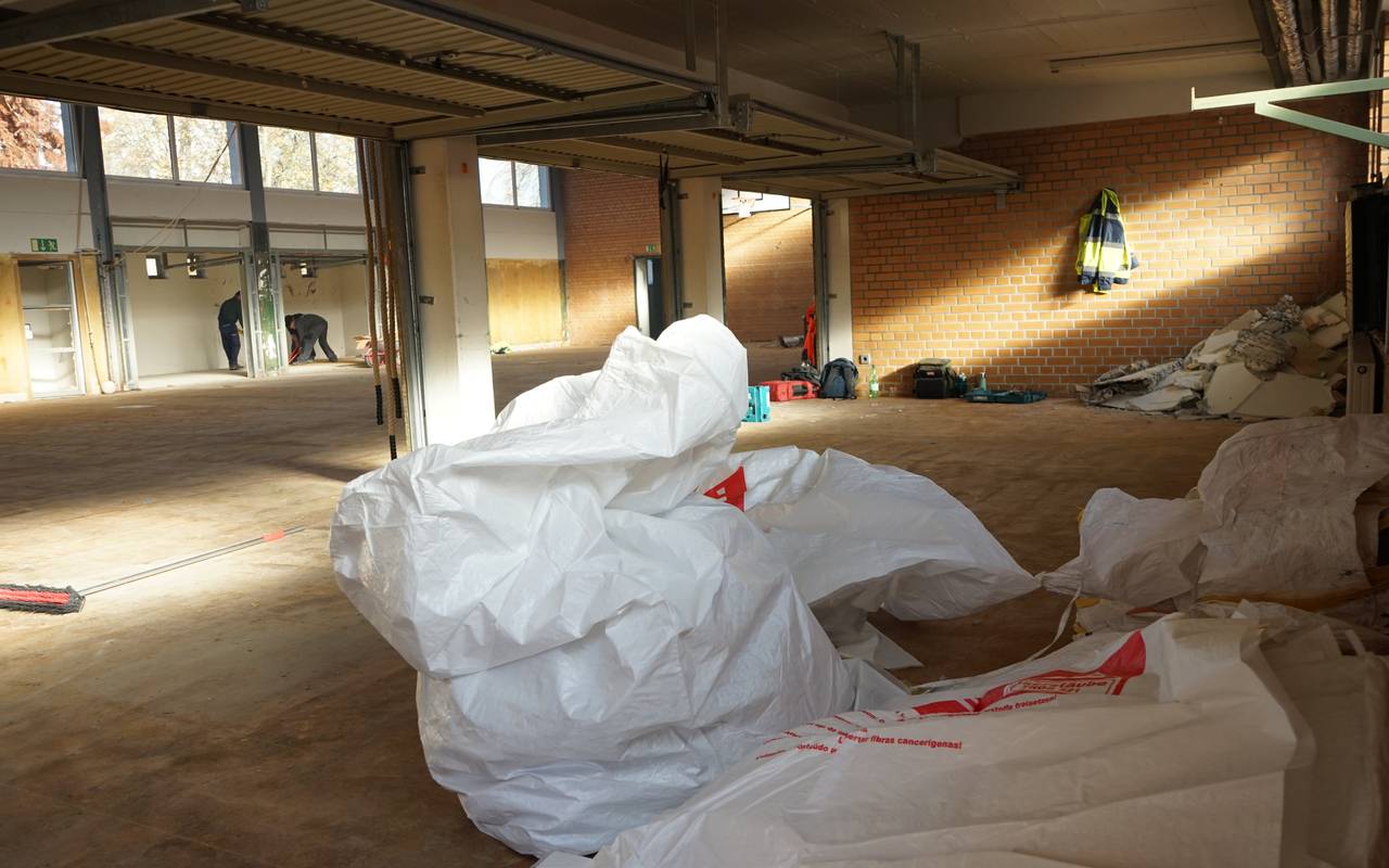 Die Turnhalle wird jetzt abgerissen. Es dauert voraussichtlich zwei Jahre, bis auf der Fläche der Ostwall-Turnhalle ein Neubau steht. Noch ist vom Abriss der Turnhalle nicht viel zu sehen, Arbeiter sind innen beschäftigt und entkernen das Gebäude. Der Neubau soll drei Etagen bekommen. Ganz unten entsteht eine Mensa, eine Küche und Nebenräume. In den Etagen darüber entstehen Räume für den Klassen- und Fachunterricht und für den Offenen Ganztag.