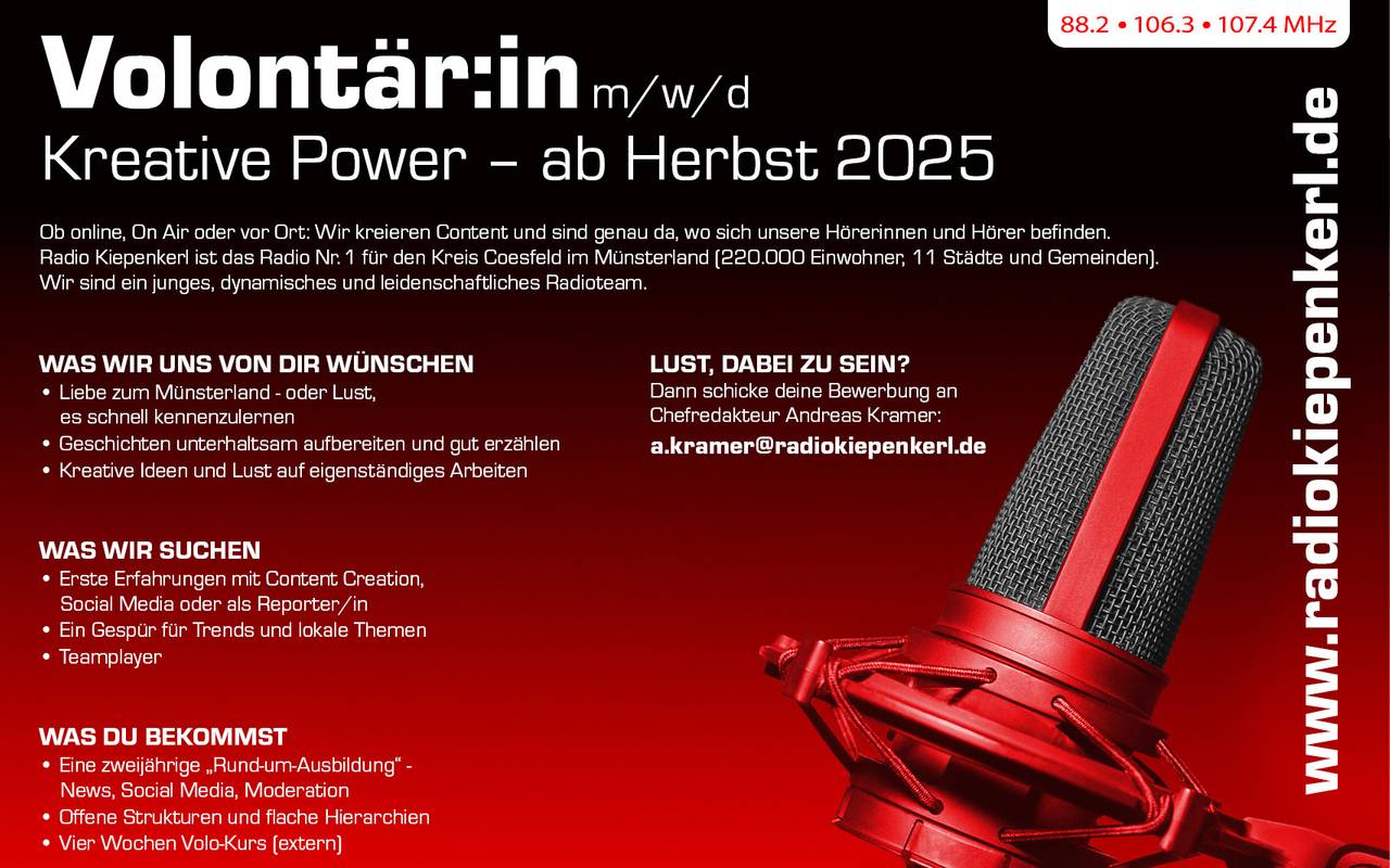 Jetzt für das Volontariat bewerben! Schick Dein Motivationsschreiben und Deinen Lebenslauf an Chefredakteur Andreas Kramer. Ganz einfach per E-Mail: a.kramer@radiokiepenkerl.de