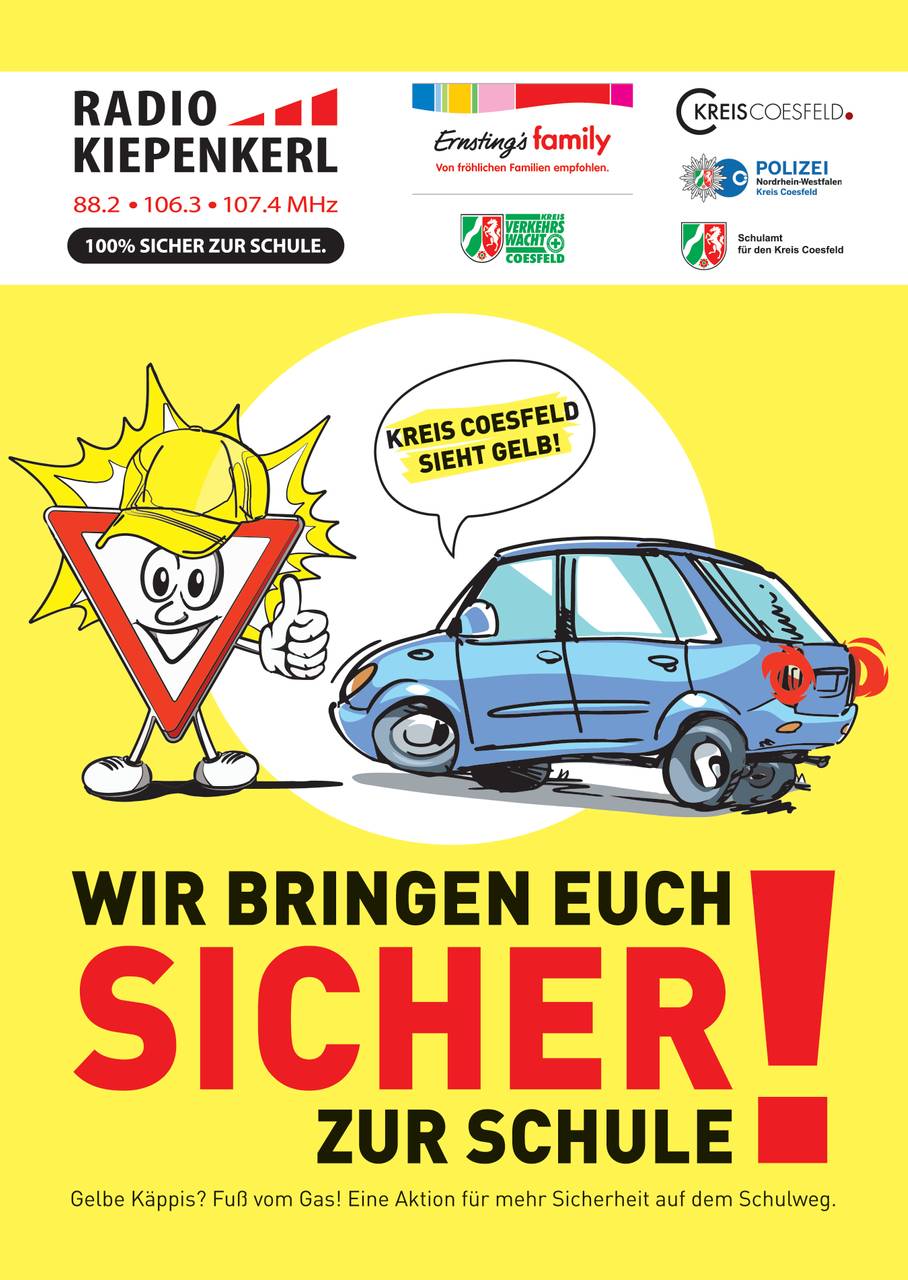 Mit dem Start in das neue Schuljahr 2024/2025 beginnt wieder die beliebte Radio Kiepenkerl Aktion "Kreis Coesfeld sieht gelb!". Wir wollen den Schulweg unserer Kinder einfach noch sicherer machen. Radio Kiepenkerl unterstützt euch dabei und verteilt an alle Erstklässler im Kreis Coesfeld "gelbe Käppis", um so für mehr Sichtbarkeit zu sorgen.