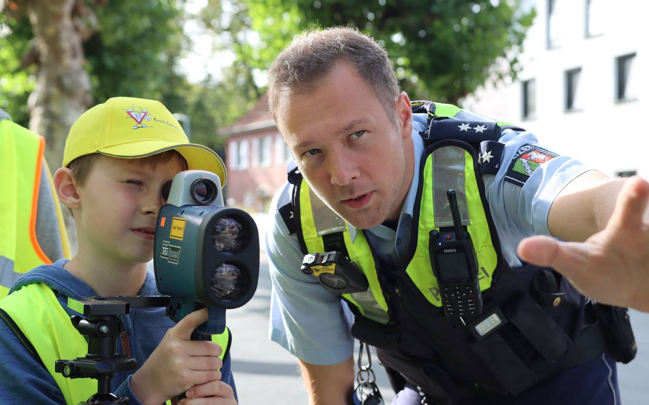 Wie in den Vorjahren hatten die Kinder anschließend die Möglichkeit, begleitet von der Verkehrswacht der Kreispolizeibehörde Coesfeld, Autofahrerinnen und Autofahrer an die Einhaltung der Regeln zu erinnern. Mit Hilfe eines Radargeräts kontrollierten sie die Geschwindigkeit von Autofahrerinnen und Autofahrern. Auch Radfahrerinnen und Radfahrer wurden angesprochen. Wer sich an die Regeln hielt, bekam von den Kindern als Dank die grüne Kelle gezeigt. Wer zu schnell unterwegs war, erhielt die rote Kelle und mahnende Worte von den jungen „Verkehrsexperten“.