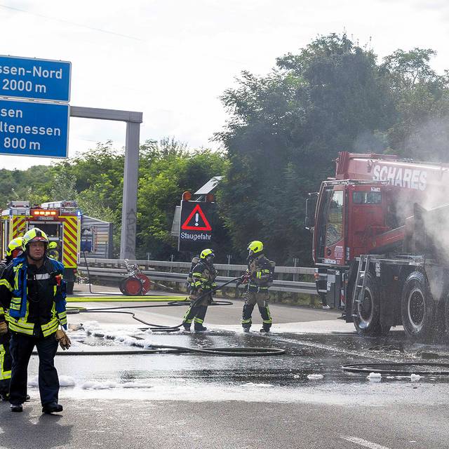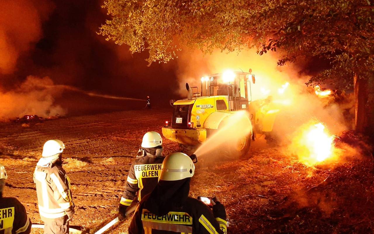 70 Feuerwehrleute aus Olfen und Datteln sind die ganze Nacht im Einsatz. Vor Ort ist Einsatzleiter Stefan Austerkamp von der Feuerwehr Olfen. Das Stroh sei zusammengepresst gewesen und sehr trocken. Deshalb brenne es so gut. Die Feuerwehr musste die Strohballen auseinanderziehen.